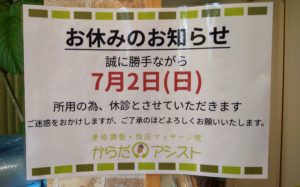 7月2日(日)は所用のため、お休みとさせていただきます。