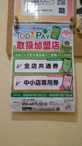 9月18日〜令和6年1月31日までの期間、戸田市在中・ 在勤の方限定で使えるTODAPAYが当店でもお支払い可能となりました!(^^)!