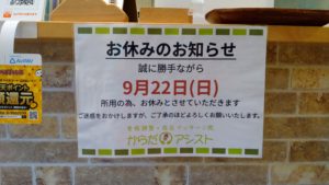 9月22日(日)は所用のためお休みとなります。ご迷惑をおかけしますが、ご了承のほどよろしくお願いいたします。