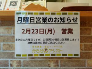 2月の3週目に3連休がありますね!通常からだアシストは月曜日お休みですが